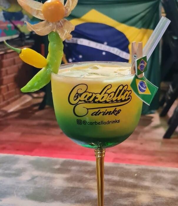 Taças e copos personalizadas com a logo da carbella drinks de uma lado e do outro lado a sua marca